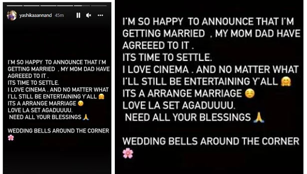 தற்போது, ஒரு சில படங்களிலும் நடிக்க ஒப்பந்தமாகி இருக்கிறார். சமூக வலைதளங்களில் சுறுசுறுப்பாக இருக்கும் யாஷிகா ஆனந்த் அவ்வப்போது ரசிகர்களுடன் தொடர்ந்து உரையாடி வருகிறார். இந்நிலையில், அவருடைய திருமணம் குறித்து சமூக வலைத்தளத்தில் பதிவிட்டுள்ளார். அதில், நான் திருமணம் செய்து கொள்வதை அறிவிப்பதில் மிகவும் மகிழ்ச்சியடைகிறேன். என் அம்மாவும் அப்பாவும் அதற்கு சம்மதித்துள்ளனர். இது செட்டில் ஆகும் நேரம். இருப்பினும், திரைப்படங்களில் இருந்து விலகப் போவதில்லை. எனக்கு சினிமா பிடிக்கும். எதுவாக இருந்தாலும் நான் உங்கள் அனைவரையும் மகிழ்விப்பேன். இது நிச்சயிக்கப்பட்ட திருமணம். லவ் எல்லாம் செட் ஆகாது. உங்கள் அனைவரின் ஆசீர்வாதமும் வேண்டும் என்று பதிவிட்டுள்ளார்.
