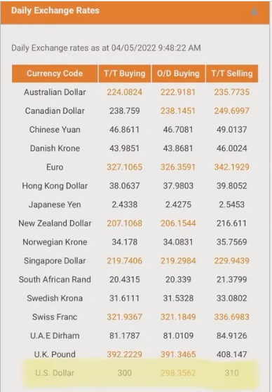 பல தனியார் வங்கிகளால் வெளியிடப்பட்ட சமீபத்திய நாணய மாற்று விகிதங்களின்படி, டொலர் ஒன்றின் விற்பனை விலை 310 ஆக விற்பனை செய்யப்படுகின்றது.