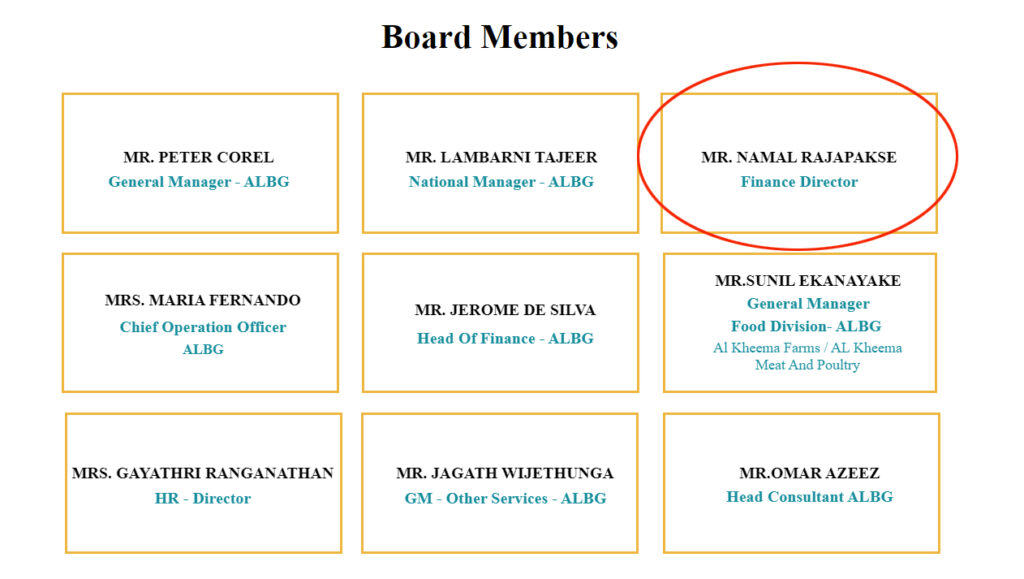 ALBG நிறுவனத்தின் பணிப்பாளர் சபையில் நாமல் ராஜபக்சவின் பெயர் குறிப்பிடப்பட்டுள்ளது.