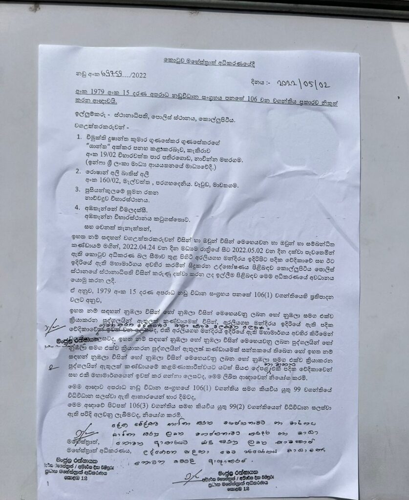 நடைபாதை மற்றும் பொதுமக்களுக்கு இடையூறு ஏற்படுத்தும் வகையில், வீதியில் இருந்து ஆர்ப்பாட்டக்காரர்கள் மற்றும் அவர்களின் சகல கட்டமைப்புகளையும் அகற்றுமாறே குறித்த உத்தரவு பிறப்பிக்கப்பட்டுள்ளது.