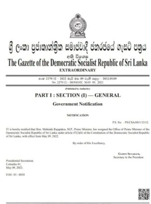 பிரதமர் மகிந்த ராஜபக்ஸவின் உத்தியோகபூர்வ ராஜினாமா கடிதத்தை, ஜனாதிபதி கோட்டாபய ராஜபக்ஸ, ஏற்றுக்கொண்டுள்ளார். அதனையடுத்து மகிந்த ராஜபக்ச பிரதமர் பதவியிலிருந்து விலகுவது தொடர்பான வர்த்தமானி அறிவித்தல் வெளியிடப்பட்டுள்ளது.