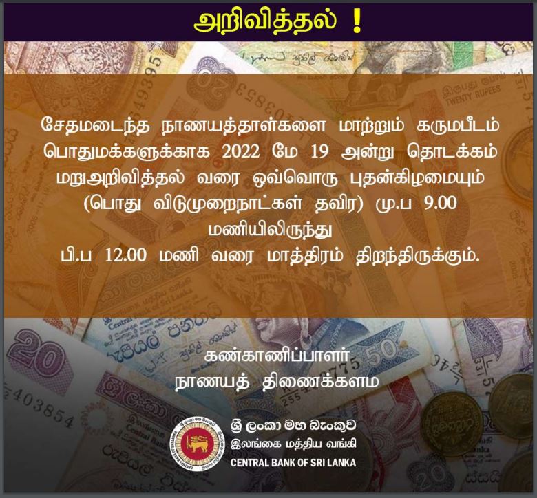2022ம் ஆண்டு மே 19ம் திகதி முதல் புதன் கிழமைகளில் (பொது விடுமுறை தினங்கள் தவிர்த்து) மறு அறிவித்தல் வரை சேதமடைந்த நாணயத்தாள் கருபீடம் பொதுமக்களுக்கு திறந்திருக்கும் என இலங்கை மத்திய வங்கி (CBSL) அறிக்கையில் தெரிவித்துள்ளது.
