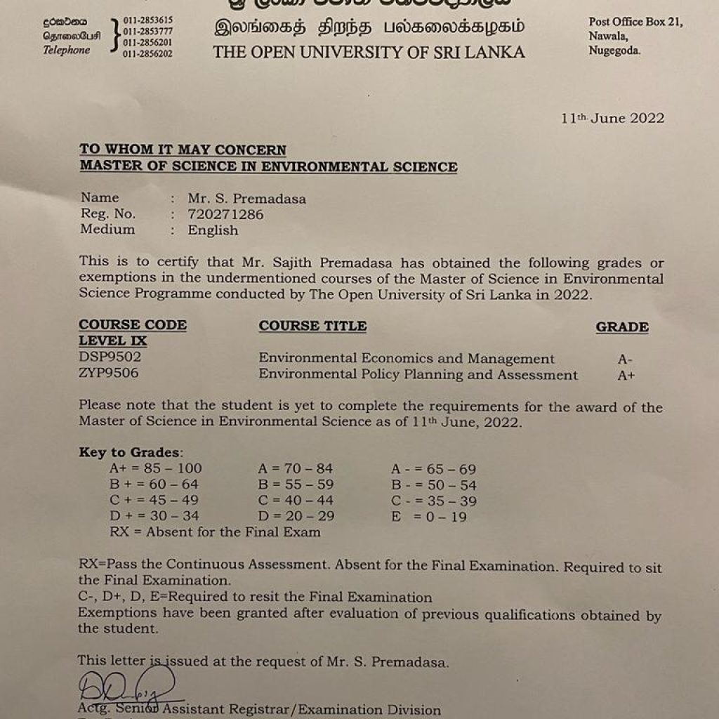 எதிர்க்கட்சித் தலைவர் சஜித் பிரேமதாச திறந்த பல்கலைக்கழகத்தில் எழுதிய சுற்றாடல் விஞ்ஞானம் தொடர்பான முதுமாணி பட்டப்படிப்புக்கான பரீட்சையில் இரண்டு பாடங்களில் சிறப்பு பெறுபேறுகளை பெற்றுள்ளார்.