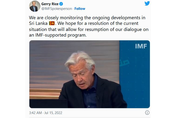 சர்வதேச நாணய நிதியத்தின் செய்தித் தொடர்பாளர் ஜெர்ரி ரைஸ், டுவிட்டரில் பதிவொன்றை பதிவிட்டு இந்த விடயத்தை குறிப்பிட்டுள்ளார்.