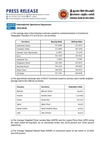 இன்றைய (08) நாணய மாற்று விகிதங்களை இலங்கை மத்திய வங்கி அறிவித்துள்ளது.
