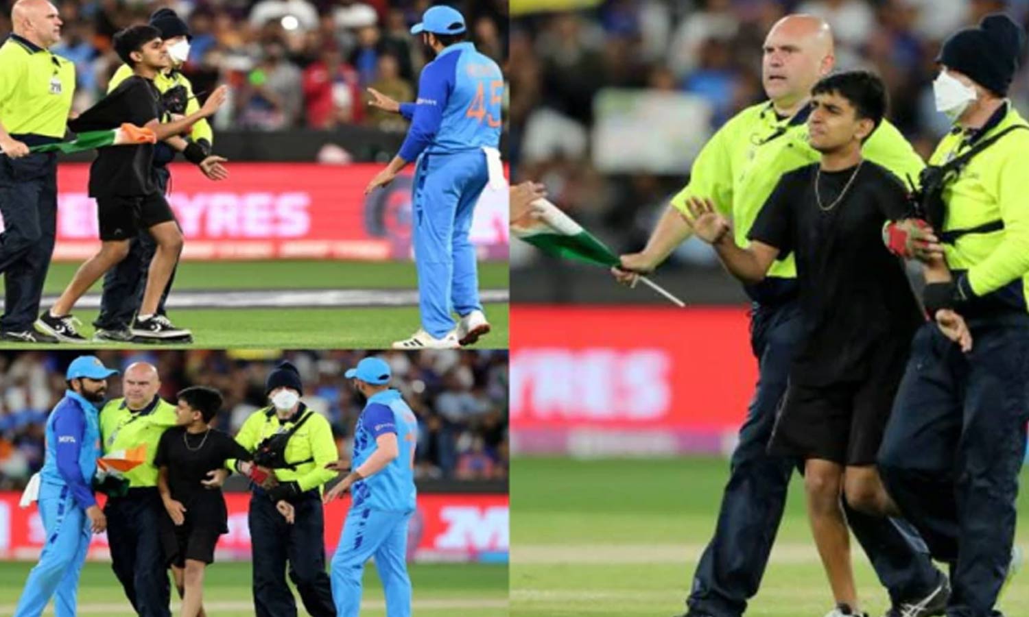 17-வது ஓவரில் இந்திய வீரர்கள் மைதானத்தில் பீல்டிங்கில் இருந்தனர். அப்போது கருப்பு சட்டை அணிந்த சிறுவன் ஒருவன் தேசிய கொடியுடன் ரோகித் சர்மாவை பார்ப்பதற்காக ஆடுகளத்துக்குள் பாதுகாப்பையும் மீறி நுழைந்தான்.