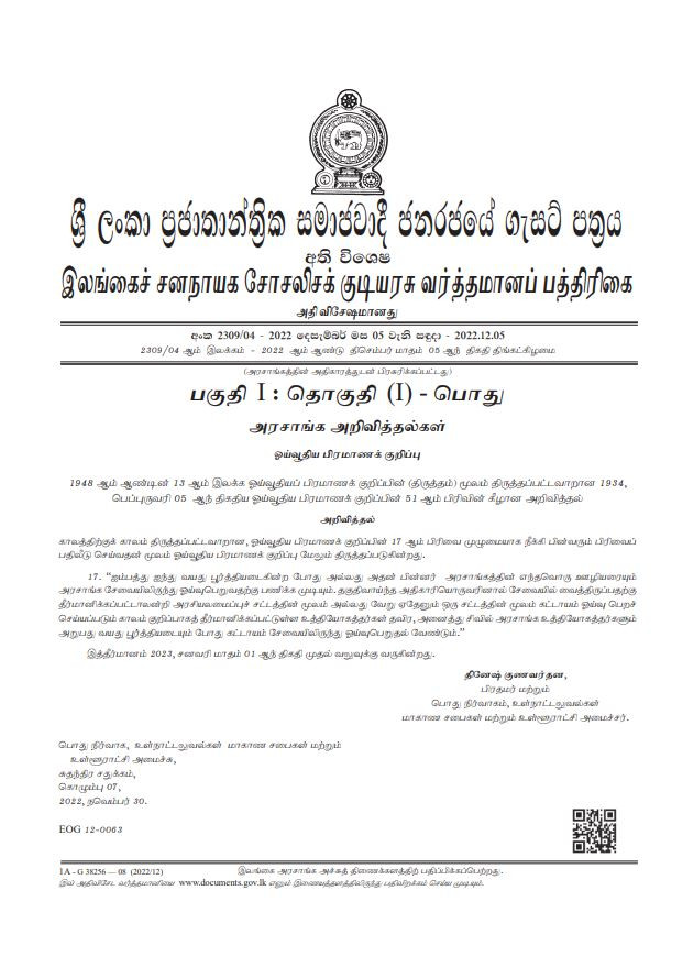 இது தொடர்பான வர்த்தமானி நேற்று (05.11.2022) பிரதமர் தினேஷ் குணவர்தனவின் கையொப்பத்துடன் வெளியிடப்பட்டுள்ளது.