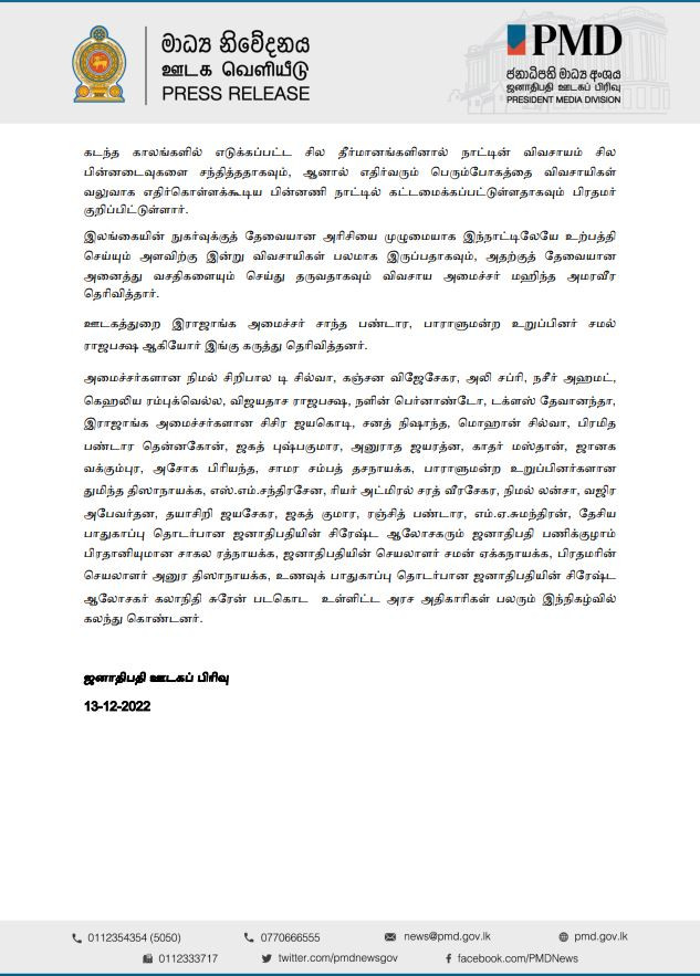 உணவுப் பாதுகாப்பு மற்றும் போஷாக்கு தொடர்பான கூட்டு பொறிமுறைக் குழுவின் பிரதிநிதிகளை தெளிவுபடுத்துவதற்காக அலரி மாளிகையில் இன்று (13.12.2022) நடைபெற்ற கலந்துரையாடலில் கலந்துகொண்ட போதே ஜனாதிபதி இவ்வாறு தெரிவித்துள்ளார்.