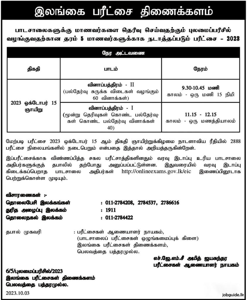 2023 தரம் 5 புலமைப்பரிசில் பரீட்சை நடத்தப்படும் திகதி குறித்து பரீட்சைகள் திணைக்களம் அறிவித்துள்ளது.