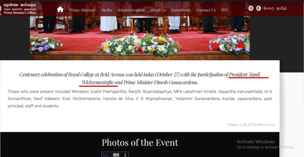 கடந்த 27ஆம் திகதி ஜனாதிபதி ரணில் விக்ரமசிங்க மற்றும் பிரதமர் தினேஷ் குணவர்தன தலைமையில் ரீட் மாவத்தை றோயல் கல்லூரியில் நடைபெற்ற நூற்றாண்டு விழா தொடர்பான செய்தியில் பிரதமர் அலுவலகம் ஜனாதிபதியின் பெயர் தவறாக பிரசுரிக்கப்பட்டது.