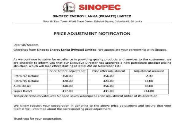 இந்நிலையில் இலங்கையில் காணப்படும் சீன எரிபொருள் நிறுவனமான சினோபெக், எரிபொருள் விலை மாற்றம் தொடர்பிலான விலைப்பட்டியலை வெளியிட்டுள்ளது.