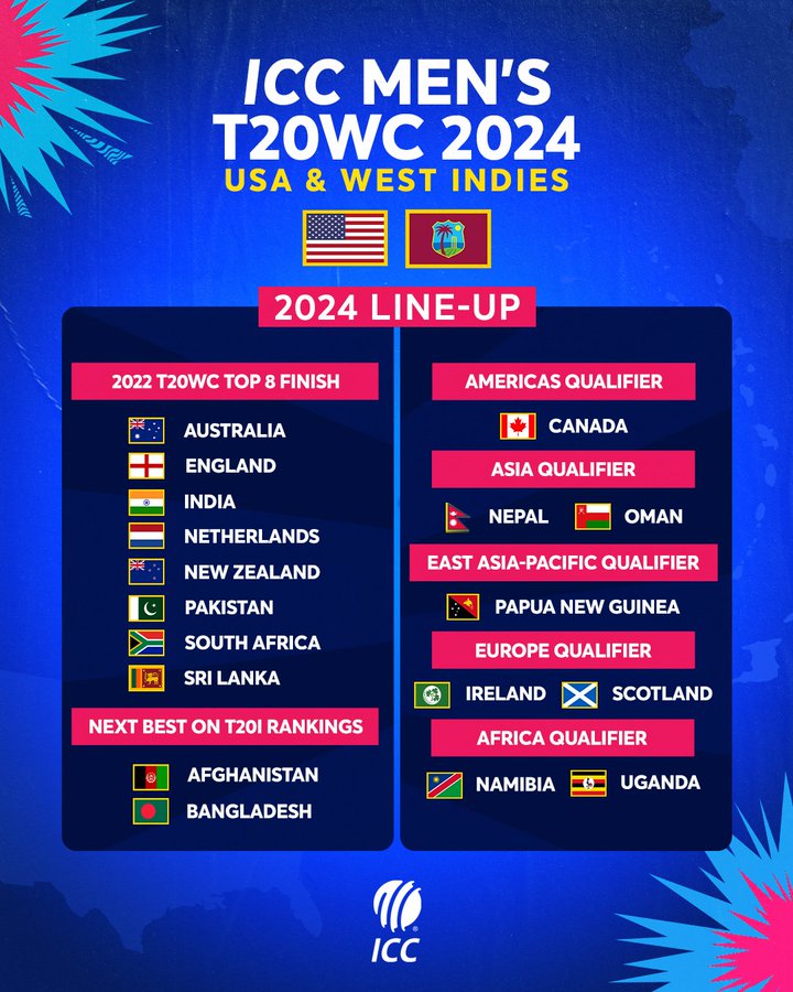 முன்னெப்போதும் இல்லாத வகையில், 2024 டி20 கிண்ண தொடரில் 20 அணிகள் பங்கேற்கின்றன. கிரிக்கெட் விளையாட்டை மேலும் பல நாடுகளுக்கு கொண்டு செல்லும் வகையில் இந்த நடவடிக்கை எடுக்கப்பட்டுள்ளது.