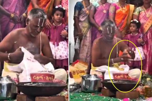 அப்படியொரு சம்பவம் நடந்து கொண்டிருக்கும் பொழுது எடுக்கப்பட்ட காணொளி தான் சமூக வலைத்தளங்களில் வைரலாகி வருகின்றது. பாரபட்சம் பாராமல் குறித்த ஐயர் பொருட்களை அள்ளிப் போடுகிறார்.