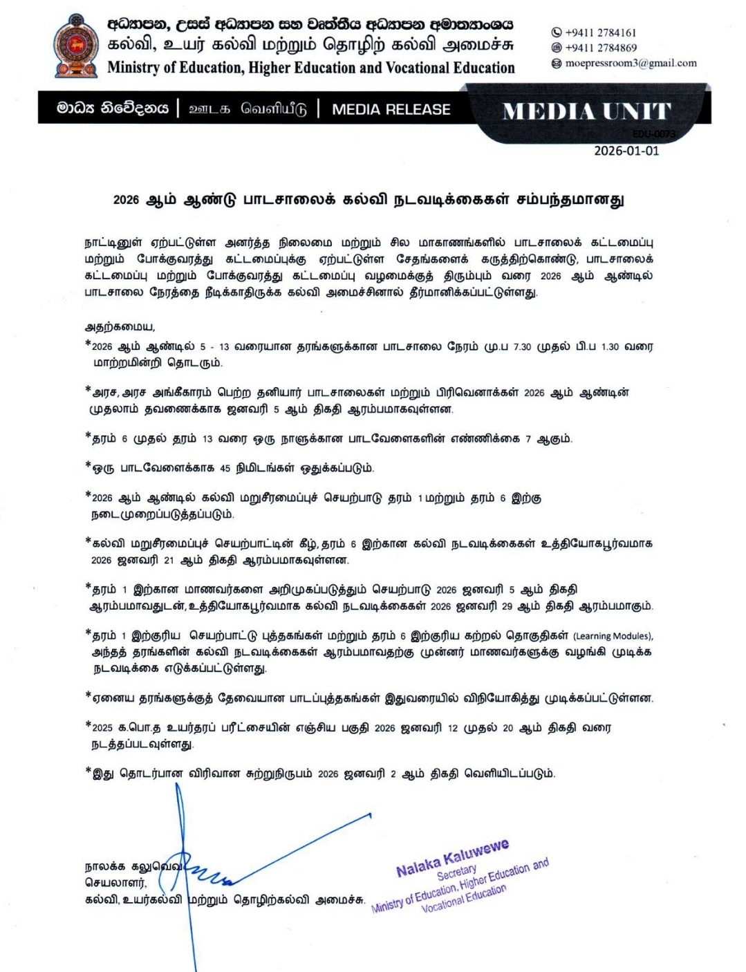 இது தொடர்பான விரிவான சுற்றறிக்கை இன்று (02.01.2026) வெளியிடப்படும் என்றும் கல்வி அமைச்சகம் அறிவித்துள்ளது.